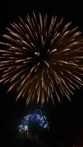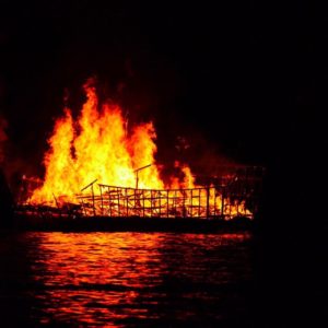綺麗な花火の真横で燃え盛る船
